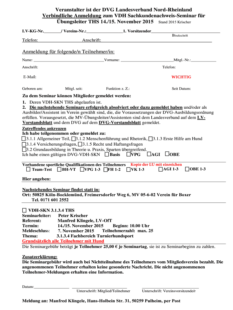 Veranstalter is her DVD Landesverband Nord-Rheinland Verbindliche Amending sum VH Sachkundenachweis-Seminar f r bungsleiter THS 14./15. November 2015