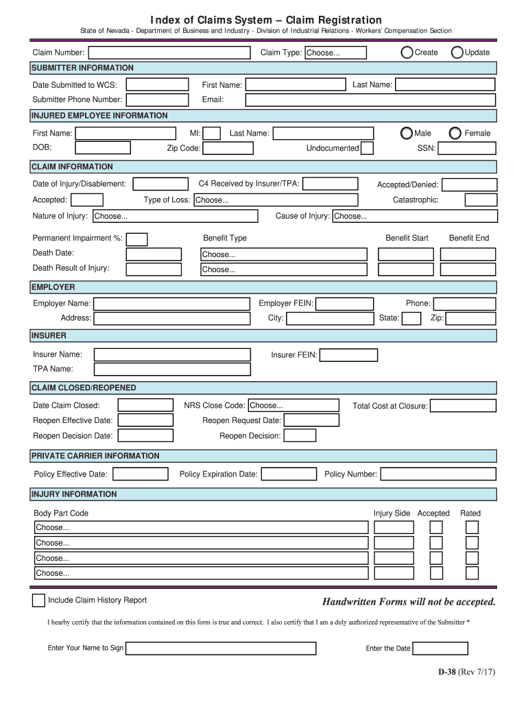Index of Claims System Claim Registration State of Nevada Department of Business and Industry Division of Industrial Relations Workers Compensation Sectionalism Number:Claim Type: Choose... CreateUpdateMaleFemaleSUBMITTER
