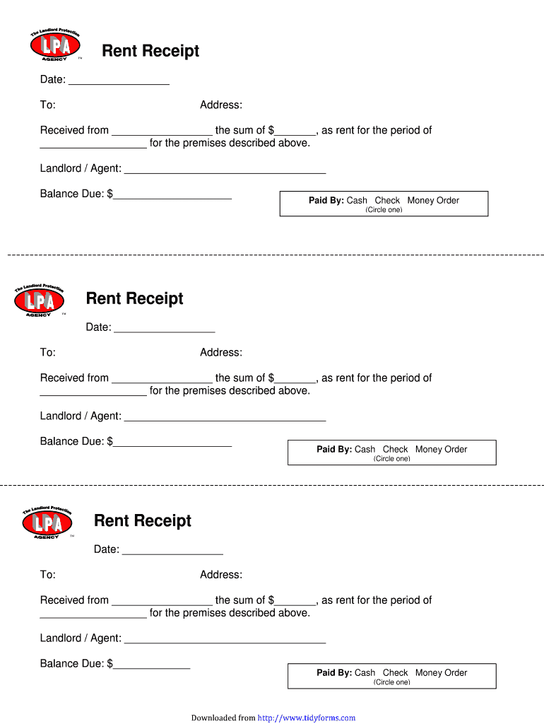 Rent Receipt Date: To: Address: Received from the sum of $, as rent for the period of for the premises described above. Landlord / Agent: Balance Due: $ Paid By: Cash Check Money Order (Circle one)