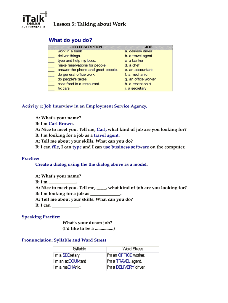 Get the free Lesson 5: Talking about Work What do you do? - iTalk ENGLISH - italkenglish