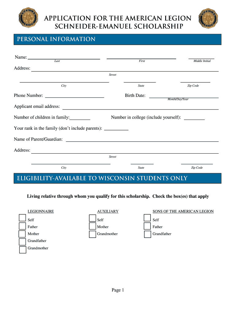 APPLICATION FOR THE AMERICAN LEGION SCHNEIDER-EMANUEL SCHOLARSHIP PERSONAL INFORMATION Name: Last First Middle Initial Address: Street City State Phone Number: Zip Code Birth Date: Month/Day/Year