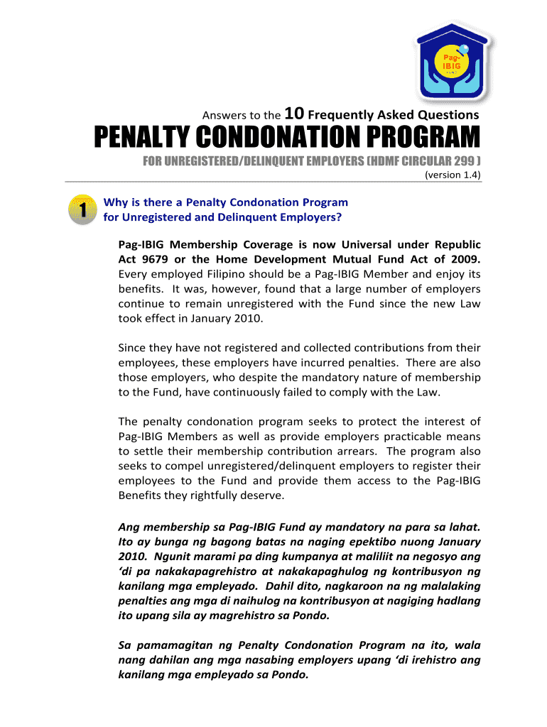 Answers to the 10 Frequently Asked Questions PENALTY CONDEMNATION PROGRAM FOR UNREGISTERED/DELINQUENT EMPLOYERS (HDMI CIRCULAR 299) (version 1.4) Why is there a Penalty Condo nation Program for Unregistered