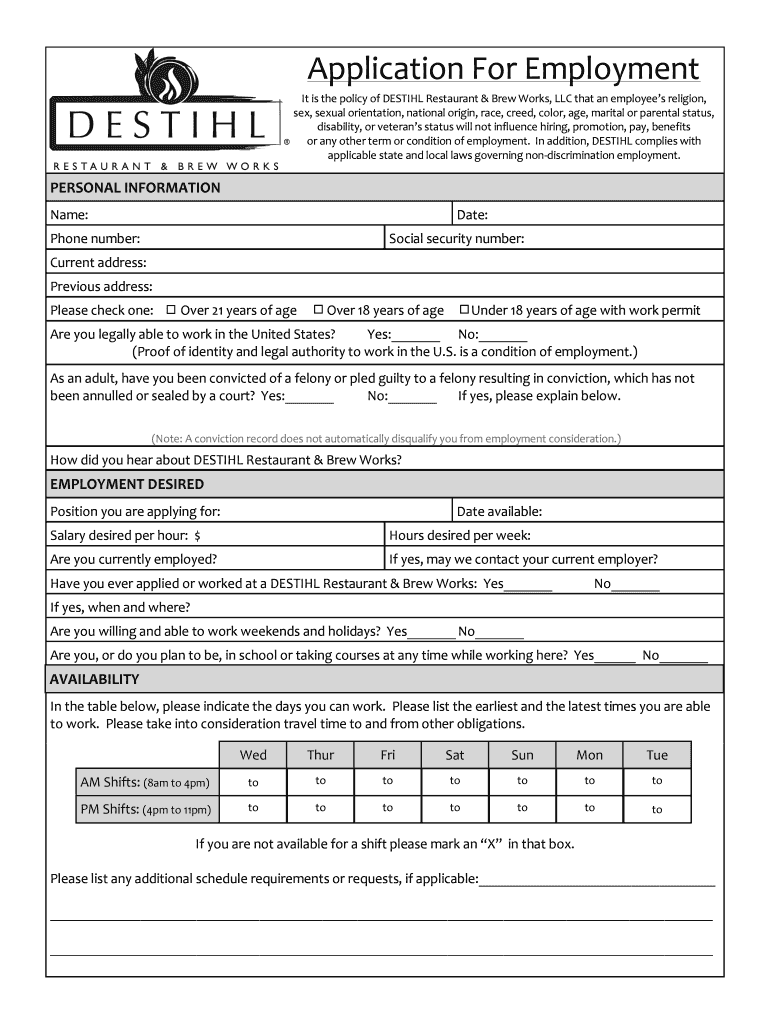 Get the free DESTIHL Restaurant Employment Application