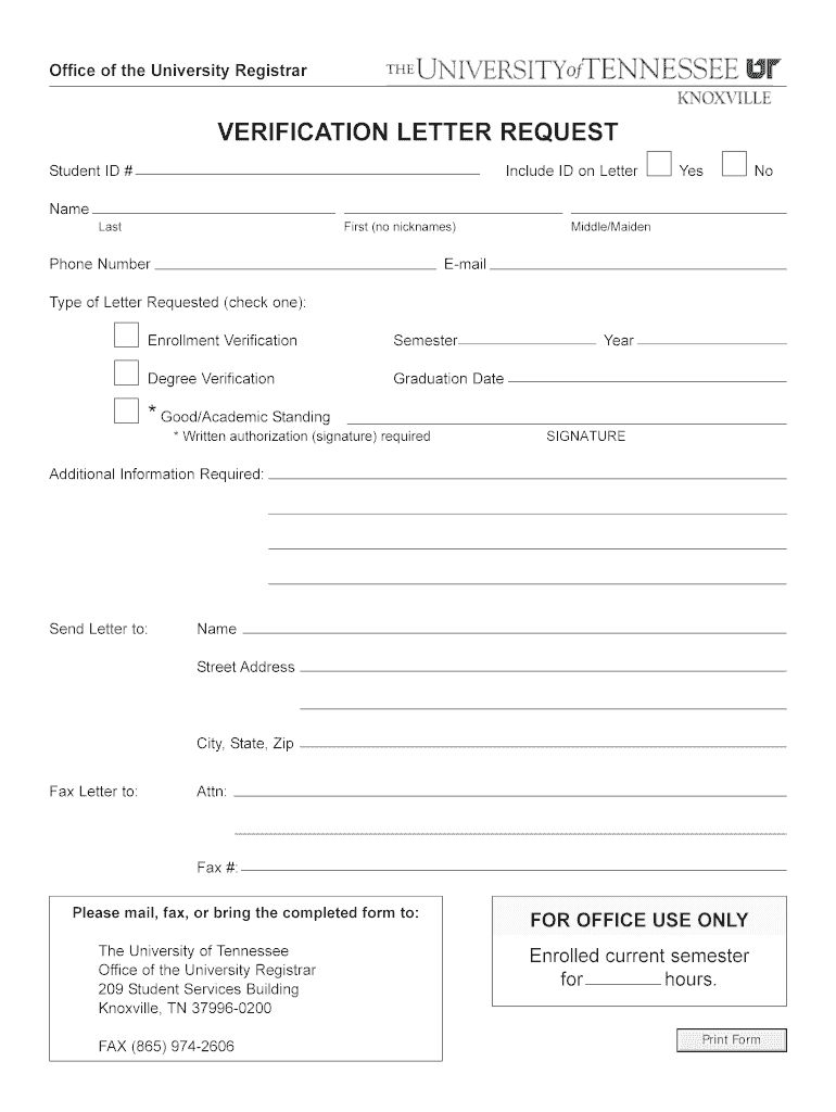The form is specifically designed for current students enrolled at the University of Tennessee who require official verification letters for enrollment, degree, or academic standing.