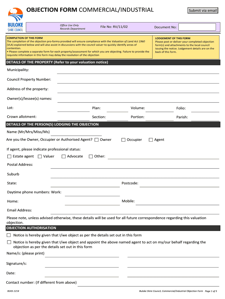 Get the free OBJECTION FORM COMMERCIAL/INDUSTRIAL - Buloke Shire ...