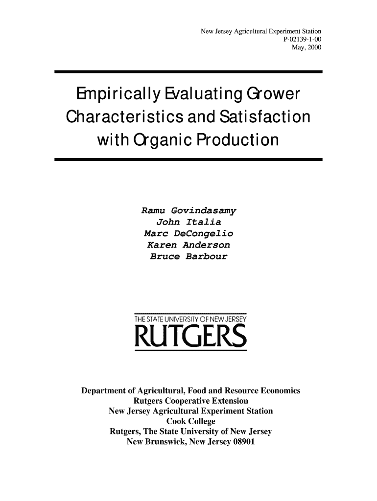 New Jersey Agricultural Experiment Station P02139100 May 2000 Empirically Evaluating Grower Characteristics and Satisfaction with Organic Production RAM Govindasamy John Italia Marc Decongest Karen