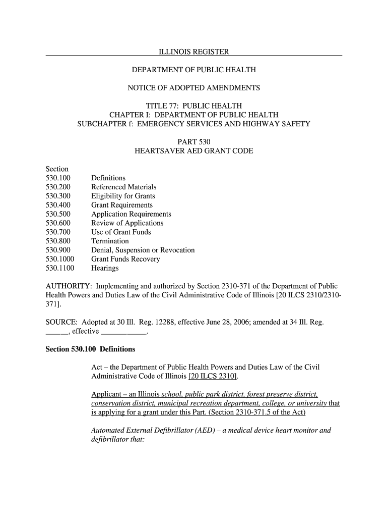 ILLINOIS REGISTER DEPARTMENT OF PUBLIC HEALTH NOTICE OF ADOPTED AMENDMENTS TITLE 77: PUBLIC HEALTH CHAPTER I: DEPARTMENT OF PUBLIC HEALTH SUBCHAPTER f: EMERGENCY SERVICES AND HIGHWAY SAFETY PART 530