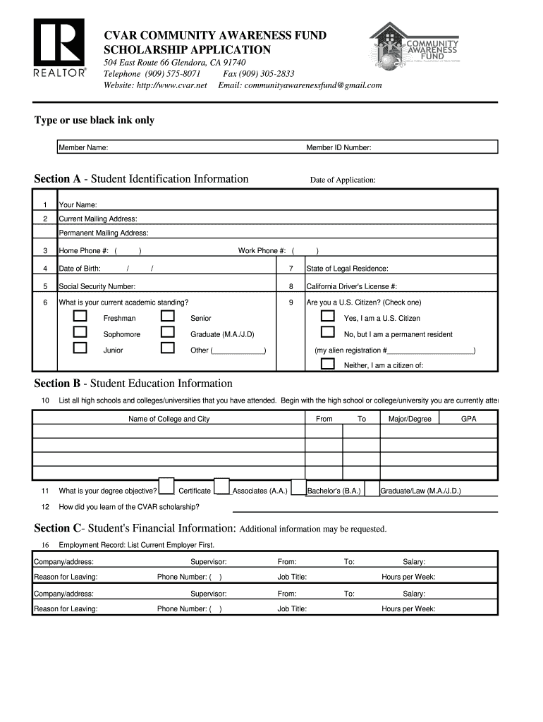 SCHOLARSHIP APPLICATION. 504 East Route 66 Glenda, CA 91740. Telephone (909) 575-8071. Fax (909) 305-2833. Website: http://www.cvar.net Email: ...