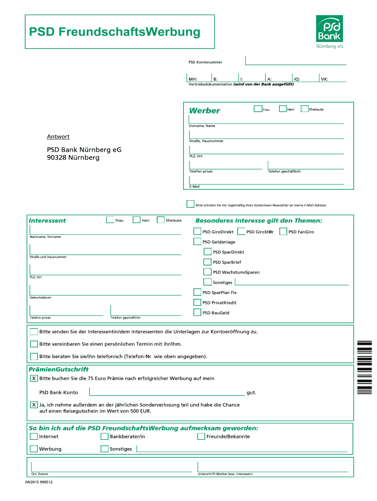 04/2015 990512 PSD FreundschaftsWerbung PSD Kontonummer MH: B: I: A: IQ: VK: Vertriebsdokumentation (word on her Bank Austen let) Ant wort PSD Bank N Robert EG