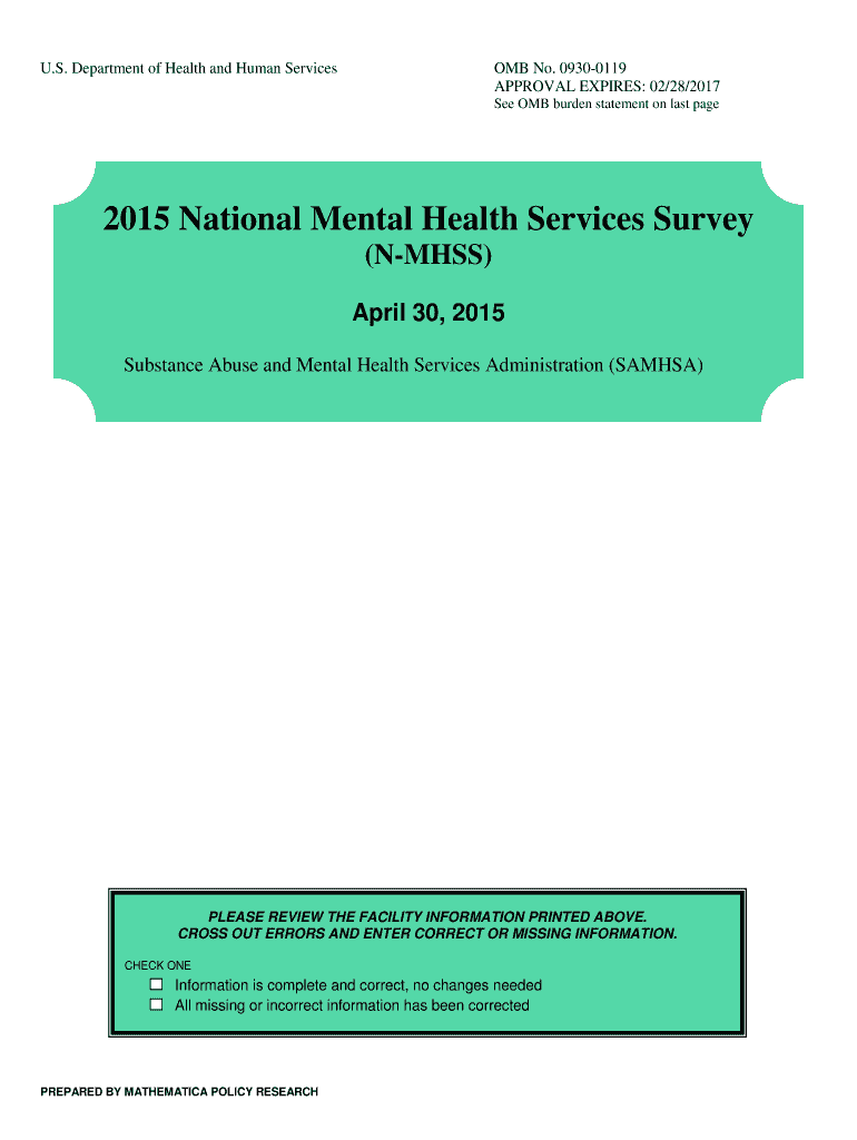 U.S. Department of Health and Human Services OMB No. 0930-0119 APPROVAL EXPIRES: 02/28/2017 See OMB burden statement on last page 2015 National Mental Health Services Survey (MASS) April 30, 2015,