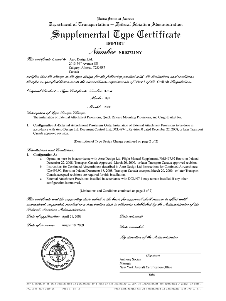United States of America Department of Transportation Federal Aviation Administration Supplemental Type Certificate IMPORT Number SR02721NY This certificate issued to Aero Design Ltd. 201339th Avenue