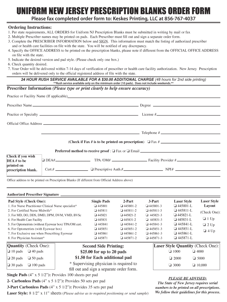 UNIFORM NEW JERSEY PRESCRIPTION BLANKS ORDER FORM Please fax completed order form to: Keynes Printing, LLC at 8567674037 Ordering Instructions: 1. Per state requirements, all orders for Uniform NJ