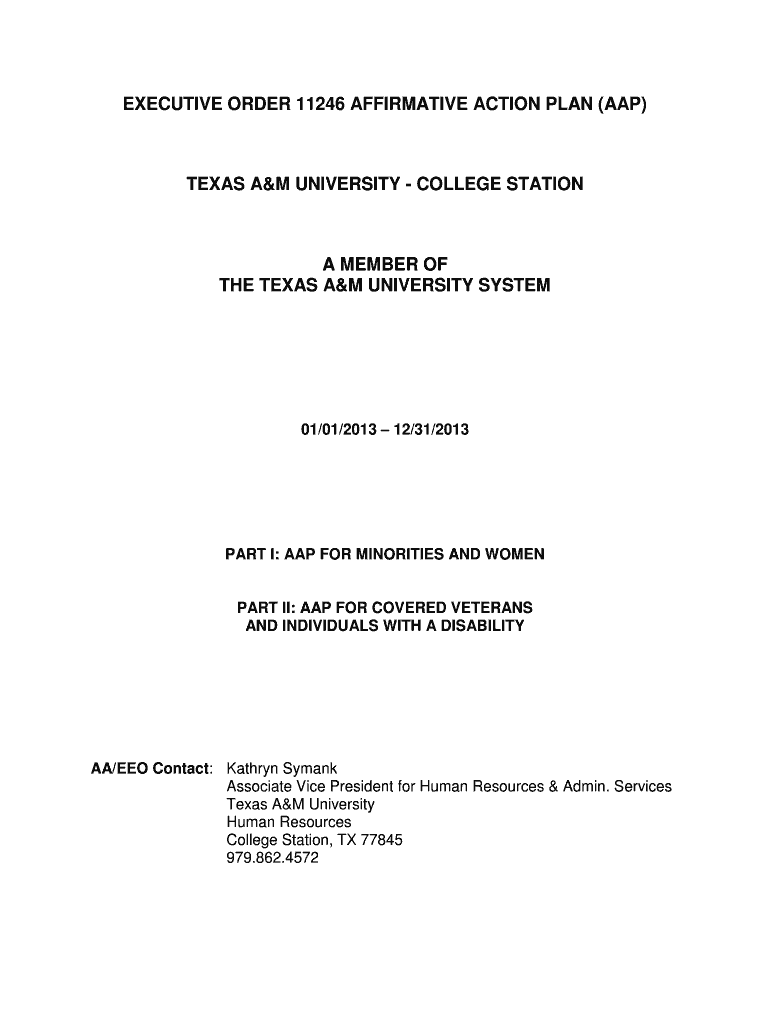 EXECUTIVE ORDER 11246 AFFIRMATIVE ACTION PLAN (AAP) TEXAS A&M UNIVERSITY COLLEGE STATION A MEMBER OF THE TEXAS A&M UNIVERSITY SYSTEM 01/01/2013 12/31/2013 PART I: AAP FOR MINORITIES AND WOMEN PART