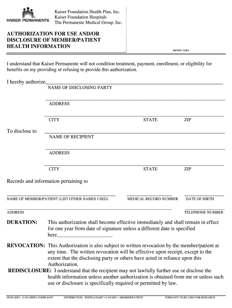 Kaiser Foundation Health Plan, Inc. Kaiser Foundation Hospitals The Permanent Medical Group, Inc. AUTHORIZATION FOR USE AND/OR DISCLOSURE OF MEMBER/PATIENT HEALTH INFORMATION IMPRINT AREA I understand