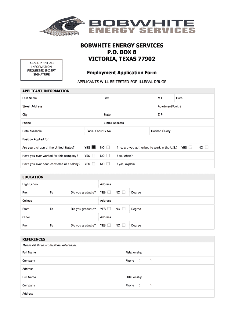 BOBWHITE ENERGY SERVICES P.O. BOX 8 VICTORIA, TEXAS 77902 PLEASE PRINT ALL INFORMATION REQUESTED EXCEPT SIGNATURE Employment Application Form APPLICANTS WILL BE TESTED FOR ILLEGAL DRUGS APPLICANT