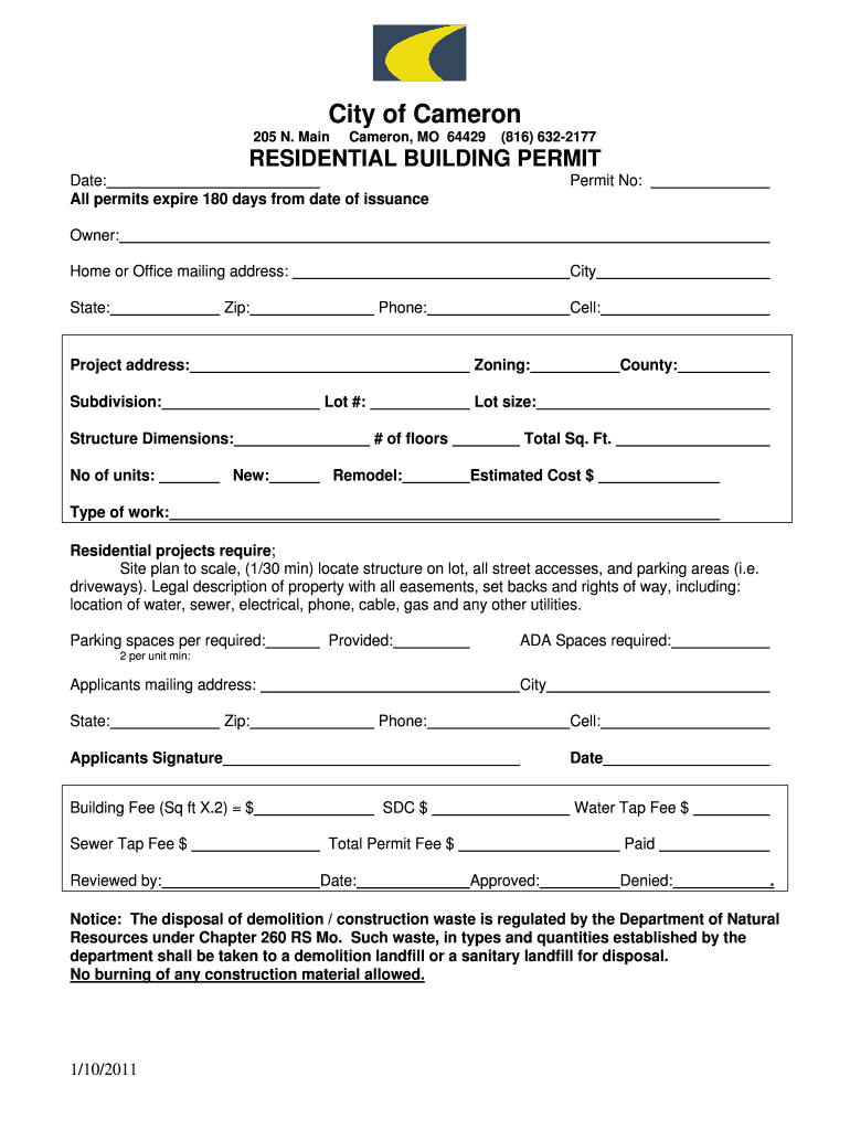 City of Cameron 205 N. Main Cameron, MO 64429 (816) 632-2177 RESIDENTIAL BUILDING PERMIT Date: Permit No: All permits expire 180 days from date of ...