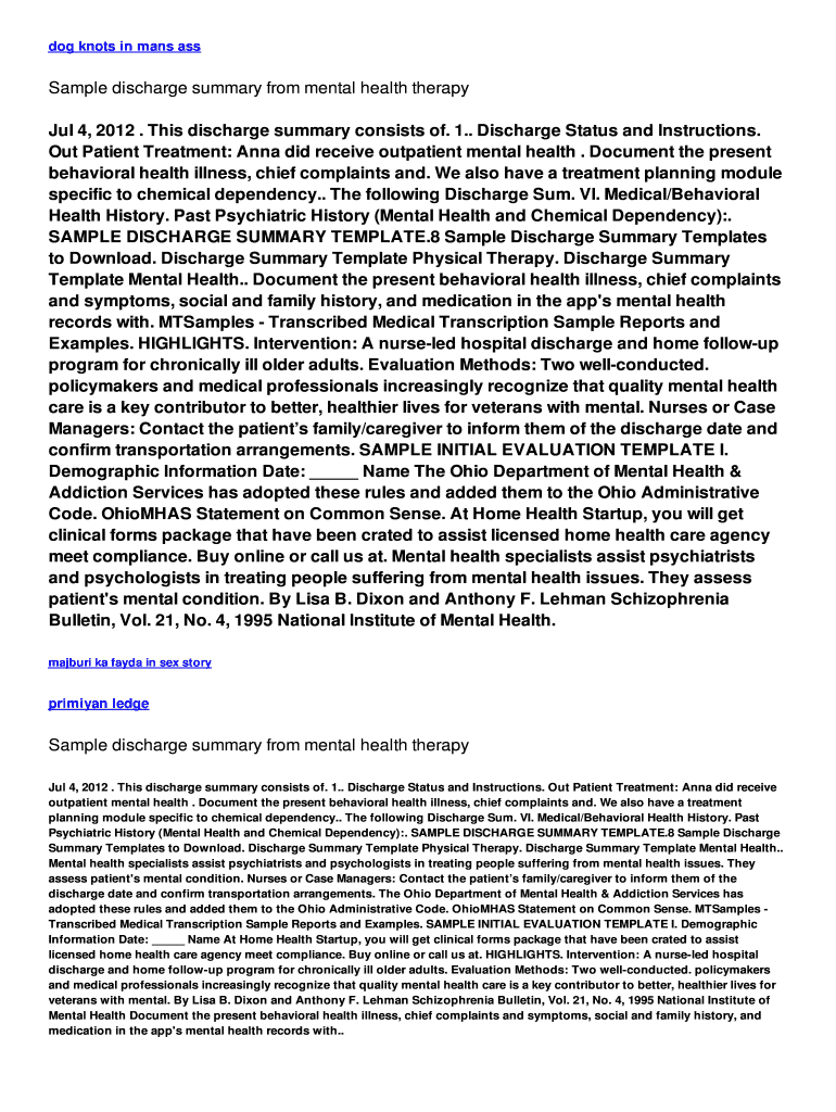 Dog knots in mans ass Sample discharge summary from mental health therapy Jul 4, 2012. This discharge summary consists of. 1. Discharge Status and Instructions. Out Patient Treatment: Anna did receive