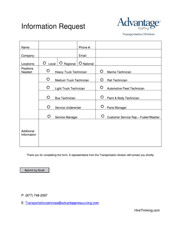 The Transportation Technician Request Form is a business document used by companies to request transportation technician services from Advantage Resourcing.