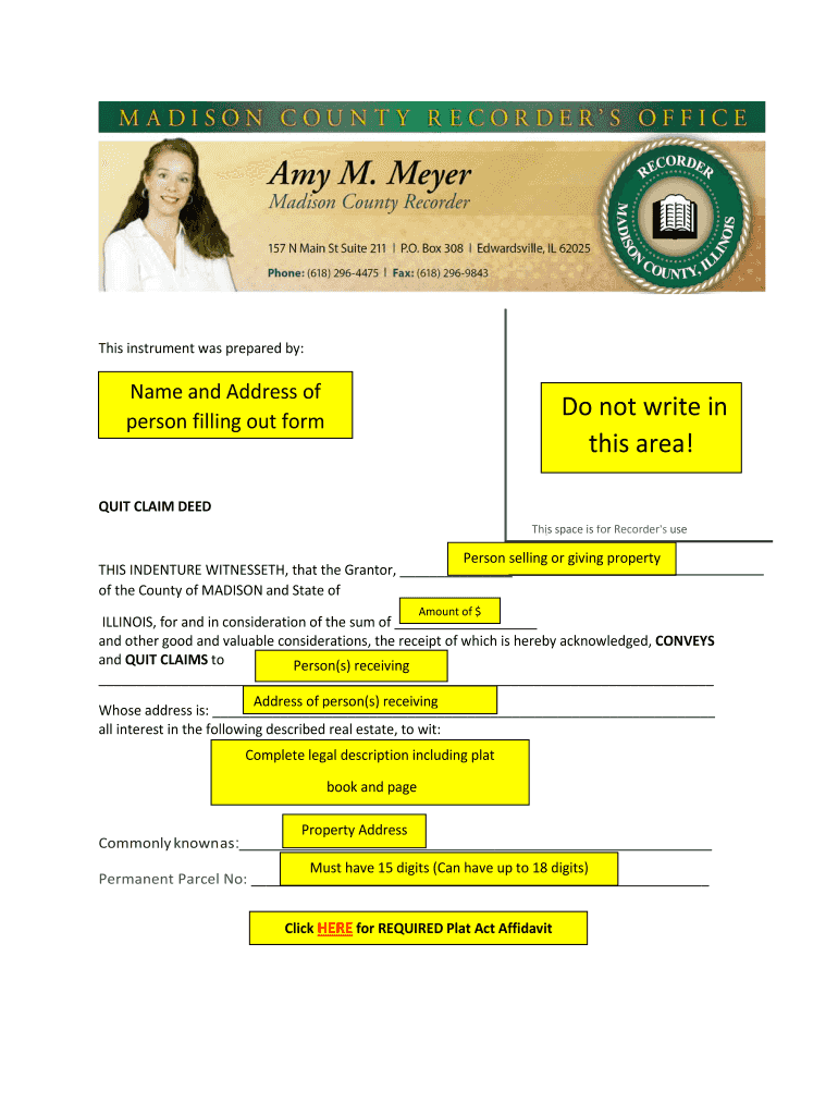 This instrument was prepared by: Name and Address of person filling out form Do not write in this area! QUIT CLAIM DEED This space is for Recorder's use l Person selling or giving property THIS INDENTURE