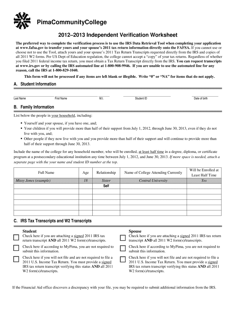The 2012–2013 Independent Verification Worksheet is a critical document issued by Pima Community College, designed to assist in the financial aid verification process. This worksheet plays a vital role for students applying for federal financial aid by verifying their financial situations and ensuring eligibility for support. Understanding this form is essential for navigating financial aid effectively.