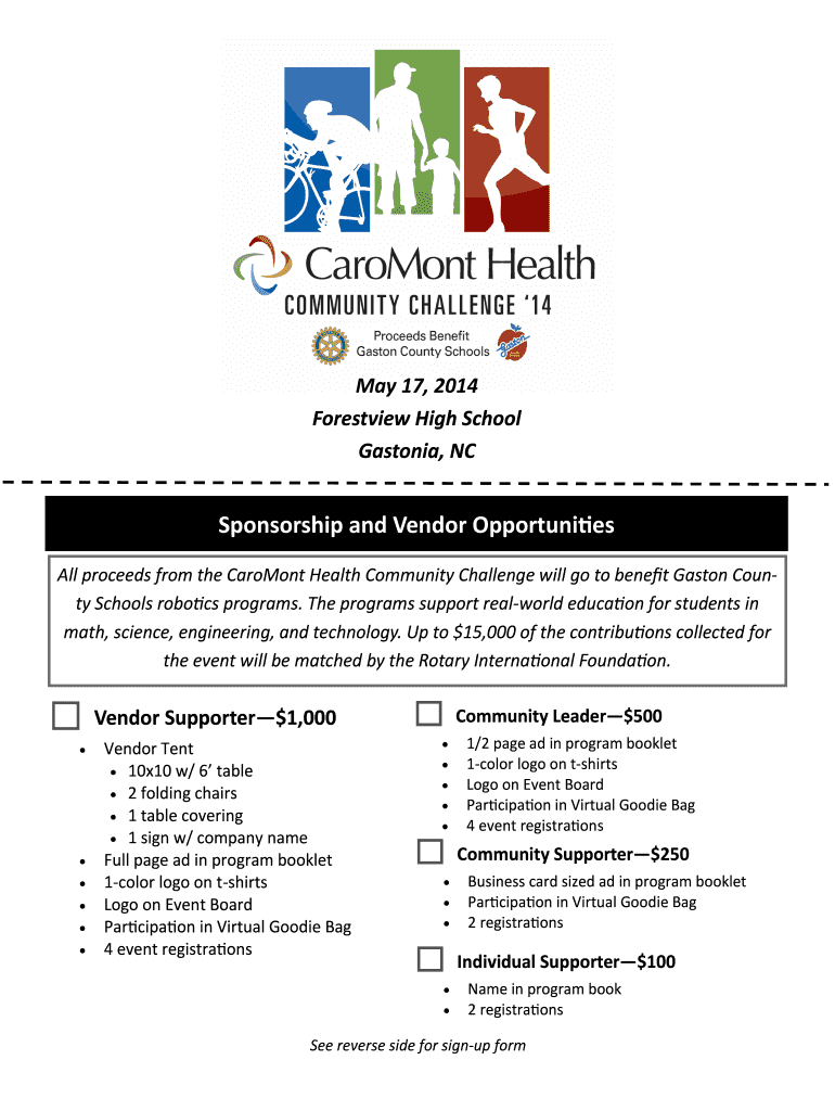 May 17, 2014. Forest view High School. Gastonia, NC. Sponsorship and Vendor Opportunities. All proceeds from the Caroming Health Community Challenge will go to benefit ...