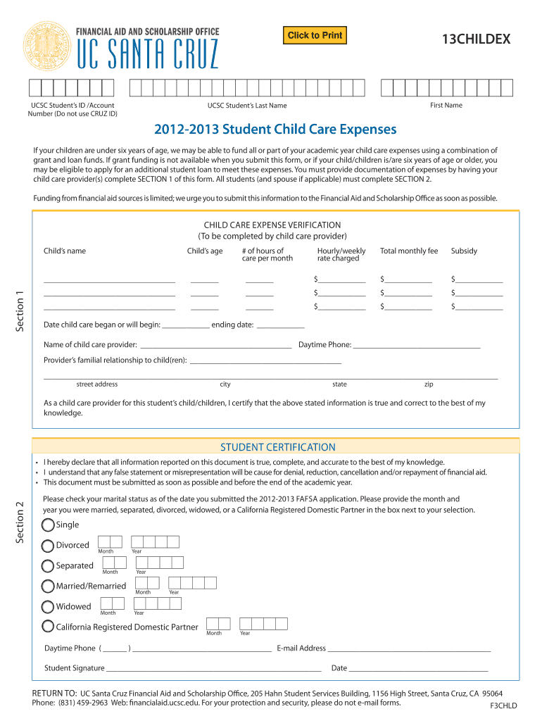 UC Santa Cruz FINANCIAL AID AND SCHOLARSHIP OFFICE UCSC Student s ID /Account Number (Do not use CRUZ ID) 13CHILDEX Click to Print First Name UCSC Student s Last Name 2012-2013 Student Child Care