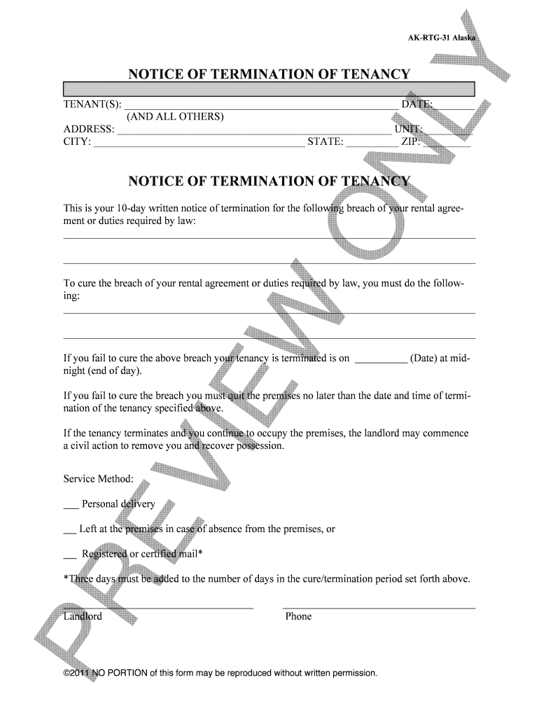 ON LY AKRTG31 Alaska NOTICE OF TERMINATION OF TENANCY TENANT(S): DATE: (AND ALL OTHERS) ADDRESS: UNIT: CITY: STATE: ZIP: NOTICE OF TERMINATION OF TENANCY This is your 10day written notice of termination