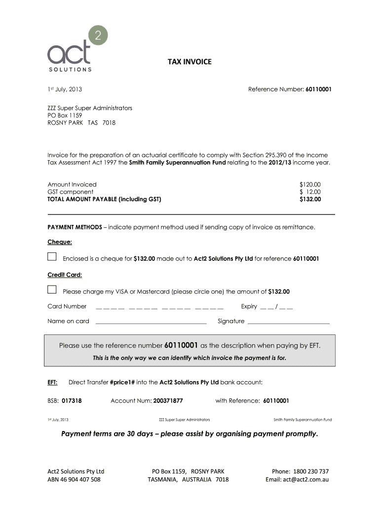 TAX INVOICE Reference Number: 60110001 1st July 2013 ZZZ Super, Super Administrators PO Box 1159 ROSY PARK TAS 7018 Invoice for the preparation of an actuarial certificate to comply with Section 295.390