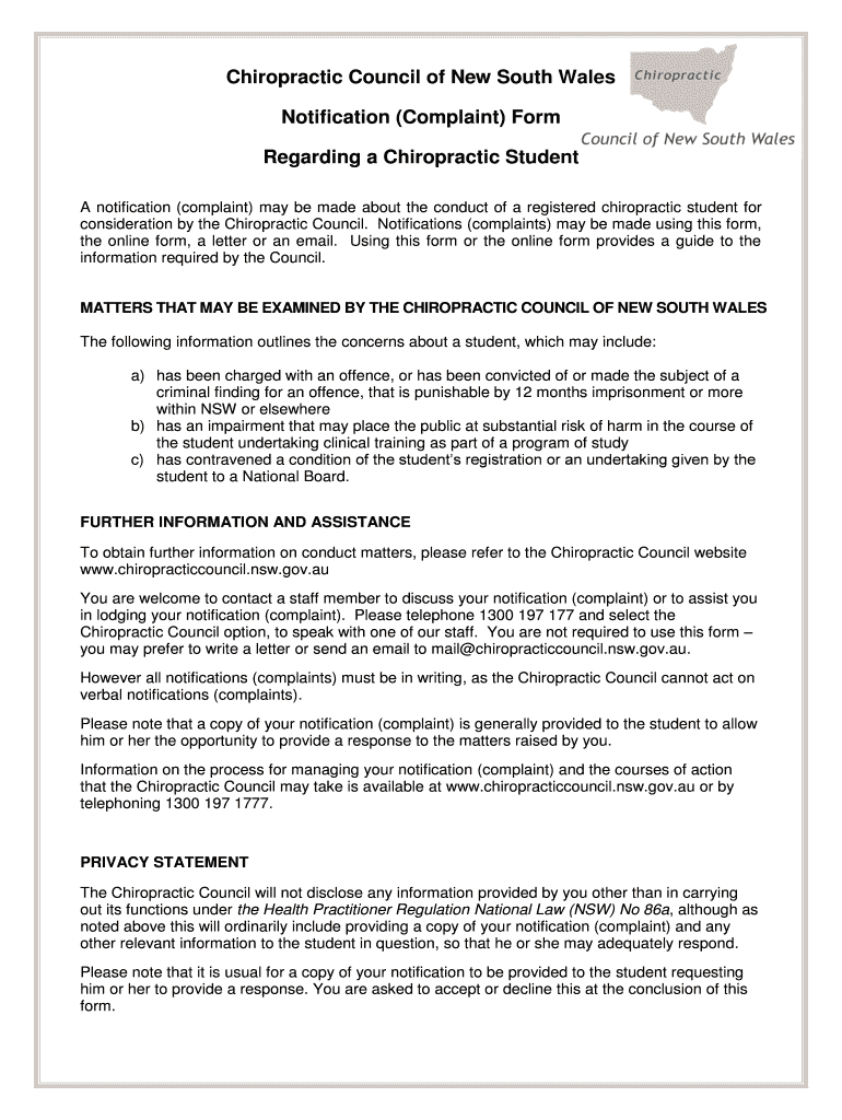 Get the free Notification (Complaint) Form Regarding a Chiropractic Student - hpca nsw gov
