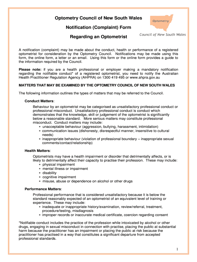 Get the free Notification (Complaint) Form Regarding an Optometrist - hpca nsw gov