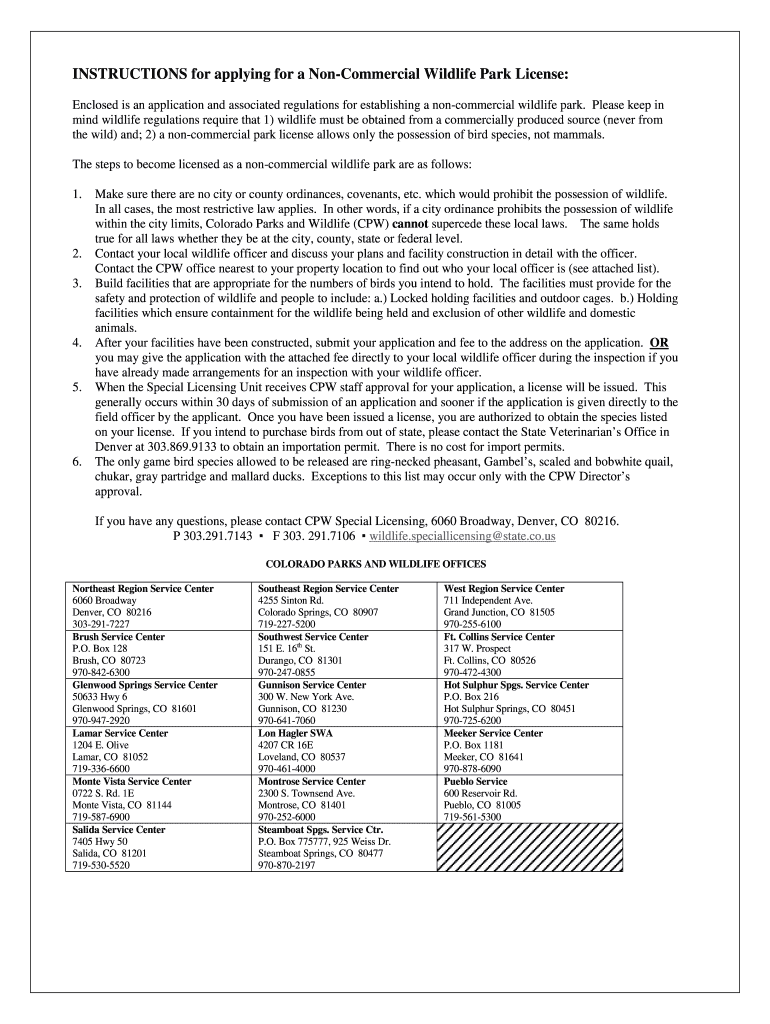 INSTRUCTIONS for applying for a Non-commercial Wildlife Park License: Enclosed is an application and associated regulations for establishing a non-commercial wildlife park. Please keep in mind wildlife