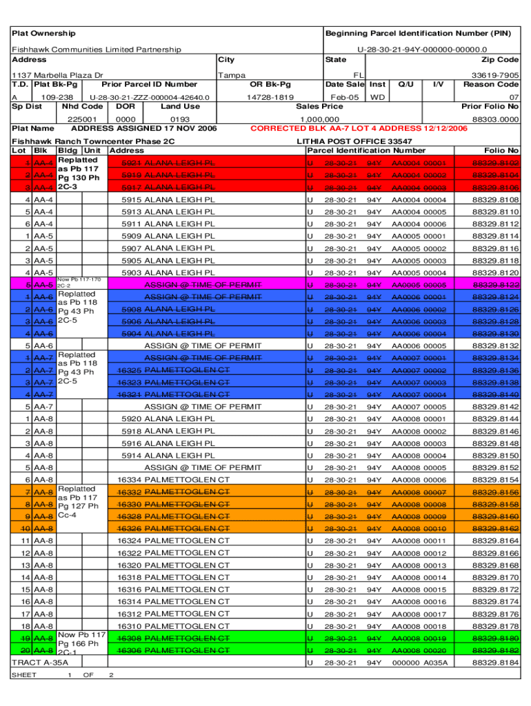 Plat OwnershipBeginning Parcel Identification Number (PIN)Fish hawk Communities Limited Partnership