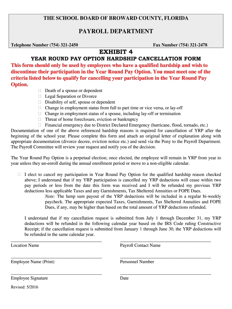 THE SCHOOL BOARD OF BROWARD COUNTY, FLORIDA PAYROLL DEPARTMENT Telephone Number (754) 3212450 Fax Number (754) 3212478 EXHIBIT 4 YEAR ROUND PAY OPTION HARDSHIP CANCELLATION From This form should only