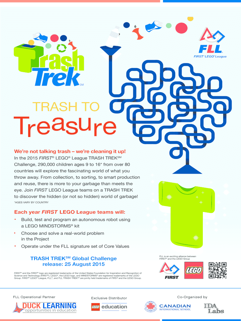 FIRST LEGOLeague Singapore 201516 TRASH TO Treasure Were not talking trash were cleaning it up! In the 2015 FIRST LEGO League TRASH TREKS Challenge, 290,000 children ages 9 to 16* from over 80 countries