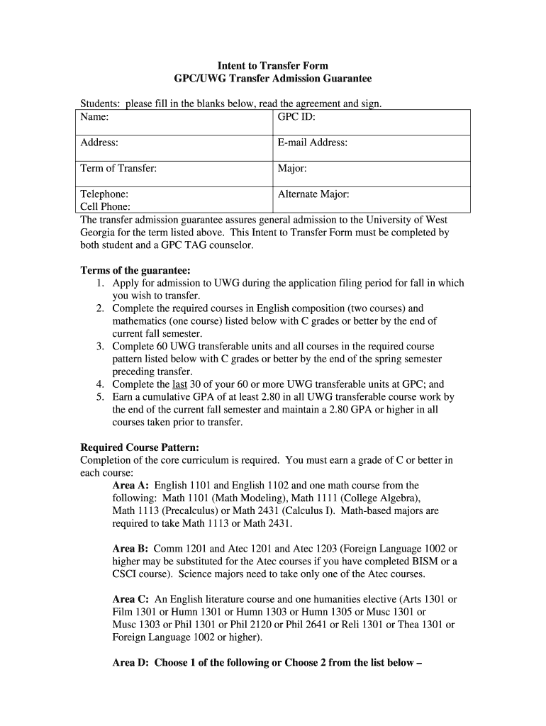 Get the free Intent to Transfer Form GPC/UWG Transfer Admission Guarantee Students: please fill i...