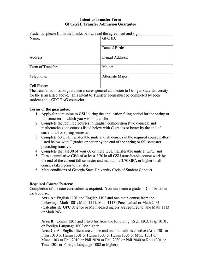 Get the free GPC GSU Transfer Admission Guarantee Form