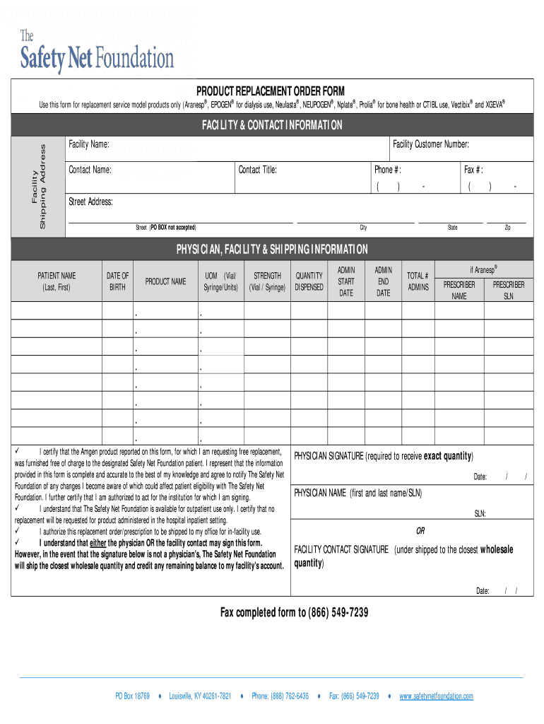 The Product Replacement Order Form is a healthcare document used by providers to request replacement of specific Amgen products for patients enrolled in the Safety Net Foundation.