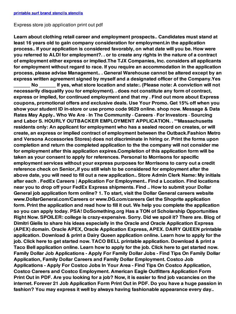 Printable surf brand stencils Express store job application print out PDF Learn about clothing retail career and employment prospects. Candidates must stand at least 16 years old to gain company consideration