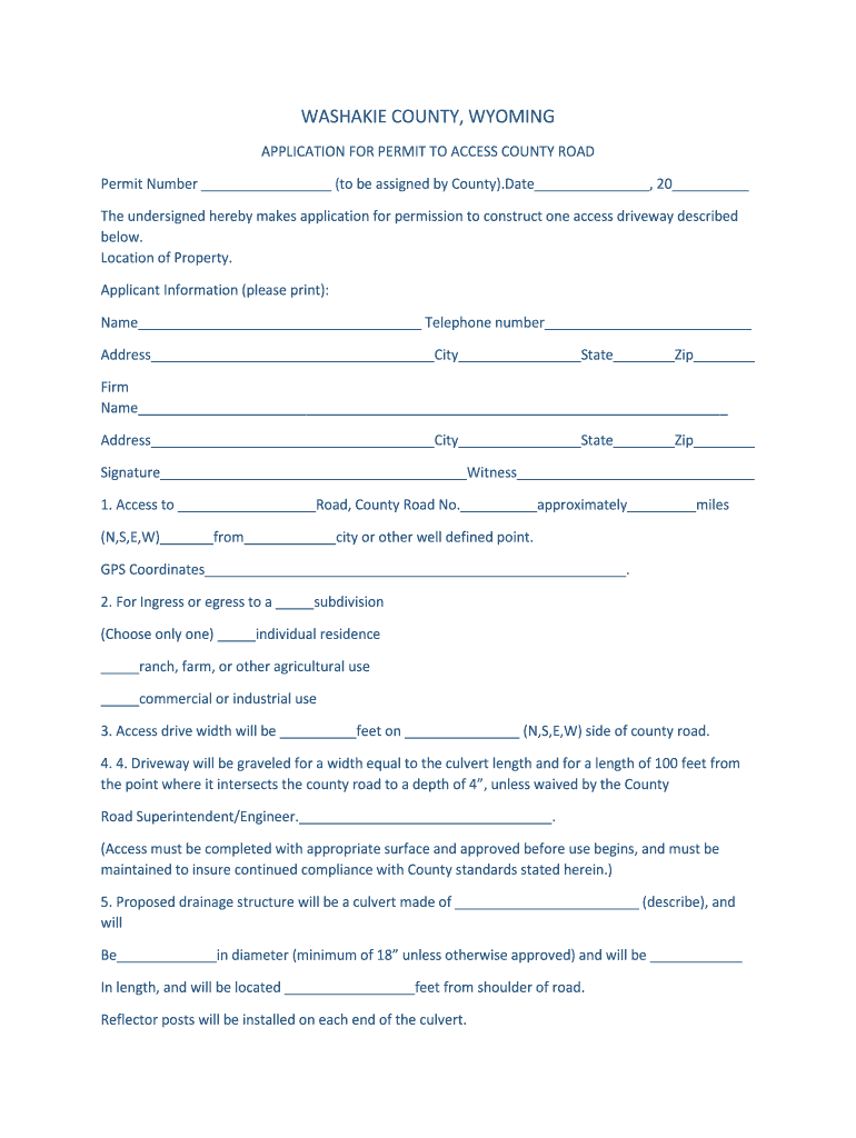 WASHABLE COUNTY, WYOMING. APPLICATION FOR PERMIT Accessing COUNTY ROAD. Permit Number (to be assigned by County). Date, 20