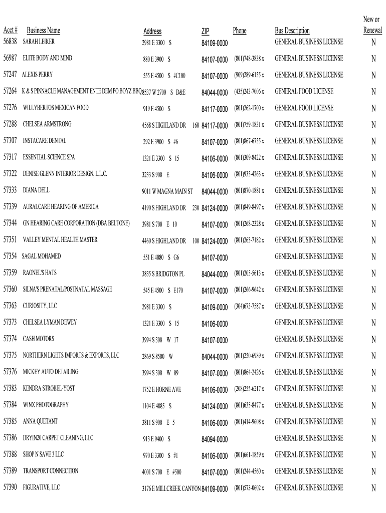 Acct # 56838 SARAH LIKER 2981 E 3300 S ZIP 841090000 56987 ELITE BODY AND MIND 880 E 3900 S 841070000 555 E 4500 S #C100 Business Name Address Phone Bus Description New or Renewal GENERAL BUSINESS