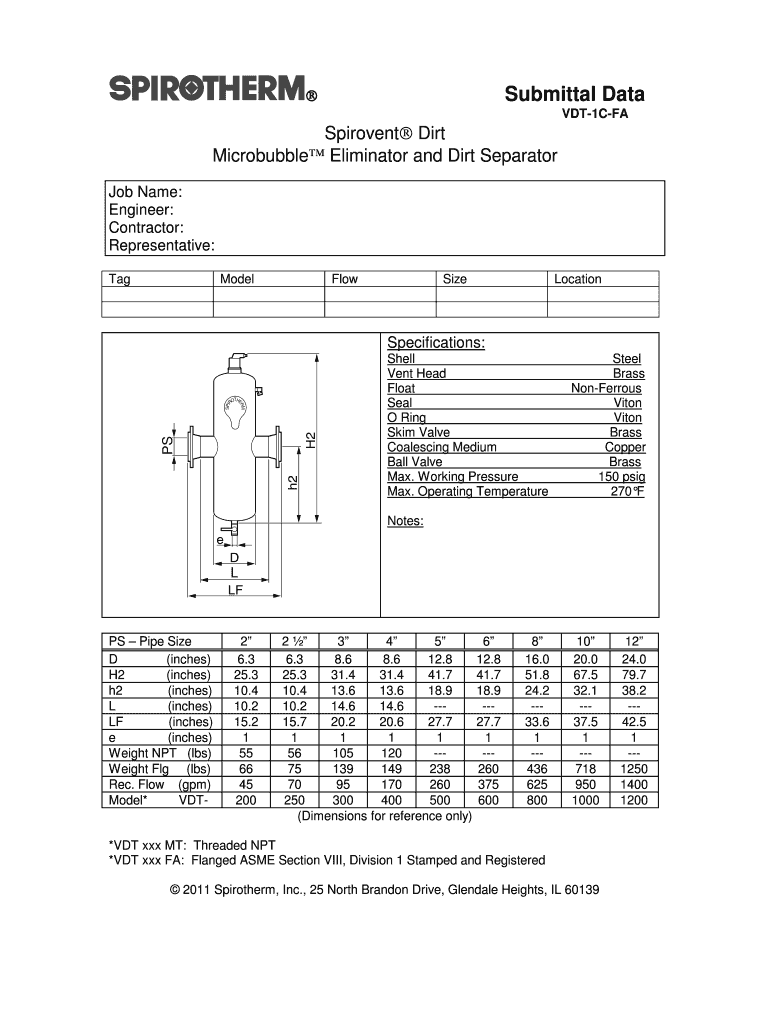 Submittal Data VDT-1C-FA. Spiro vent Dirt. Microbubble Eliminator and Dirt Separator. Job Name: Engineer: Contractor: Representative: