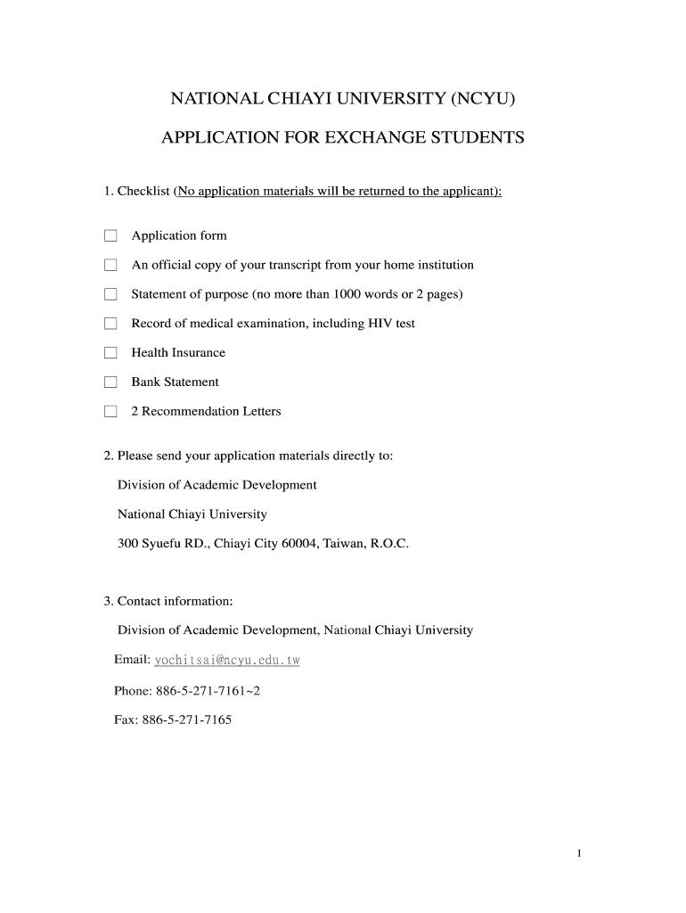 NATIONAL C HI AYI UNIVERSITY (NCY) APPLICATION FOR EXCHANGE STUDENTS 1. Checklist (No application materials will be returned to the applicant): Application form An official copy of your transcript