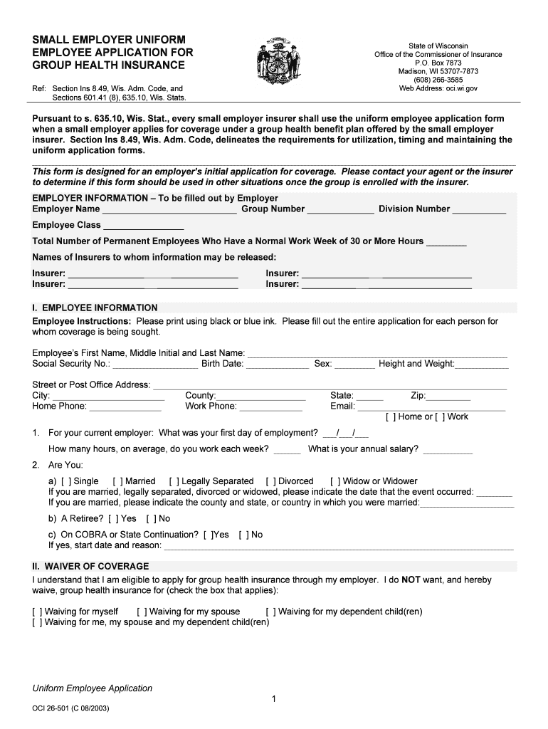 SMALL EMPLOYER UNIFORM EMPLOYEE APPLICATION FOR GROUP HEALTH INSURANCE State of Wisconsin Office of the Commissioner of Insurance P.O. Box 7873 Madison, WI 53707-7873 (608) 266-3585 Web Address: OCI.WI.gov