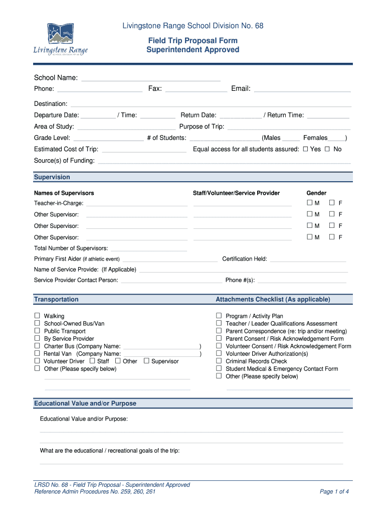 Livingstone Range School Division No. 68. Field Trip Proposal Form. Superintendent Approved. School Name: Phone: ...