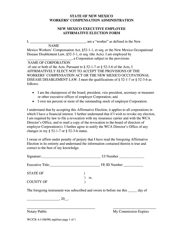STATE OF NEW MEXICO WORKERS COMPENSATION ADMINISTRATION NEW MEXICO EXECUTIVE EMPLOYEE AFFIRMATIVE ELECTION FORM I, am a worker as defined in the New NAME Mexico Workers Compensation Act, 5211, et