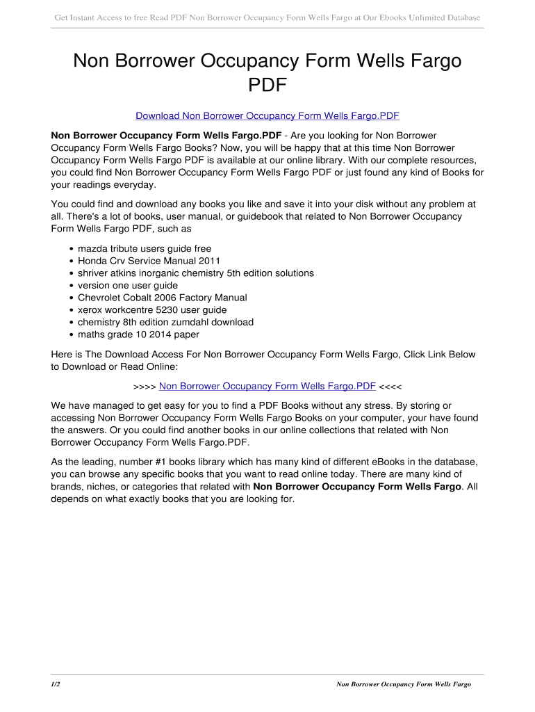 Get Instant Access to free Read PDF Non Borrower Occupancy Form Wells Fargo at Our E-Books Unlimited Database Non Borrower Occupancy Form Wells Fargo PDF Download Non Borrower Occupancy Form Wells