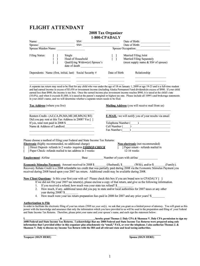 FLIGHT ATTENDANT 2008 Tax Organizer 1800CPADALY Name: SS#: Date of Birth: Spouse: SS#: Date of Birth: Spouse Maiden Name: Spouse Occupation: Filing Status: Single Head of Household Qualifying Widow(er)