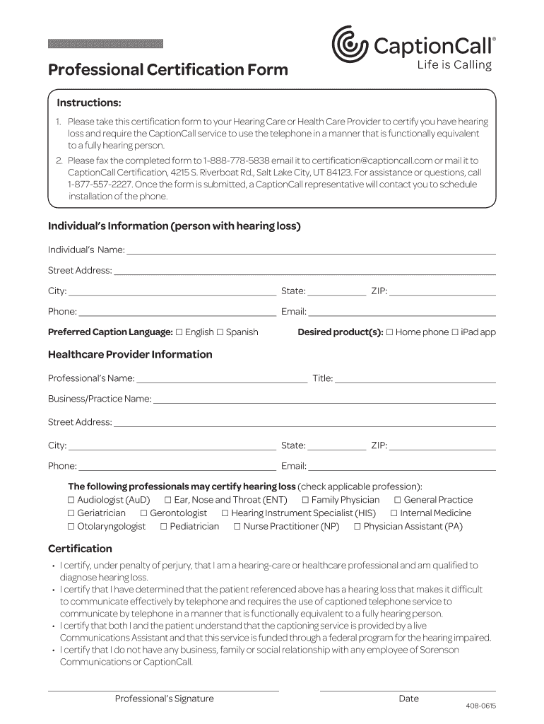 Professional Certification Form Individual s Information (person with hearing loss) Individual s Name: Street Address: City: State: ZIP:
