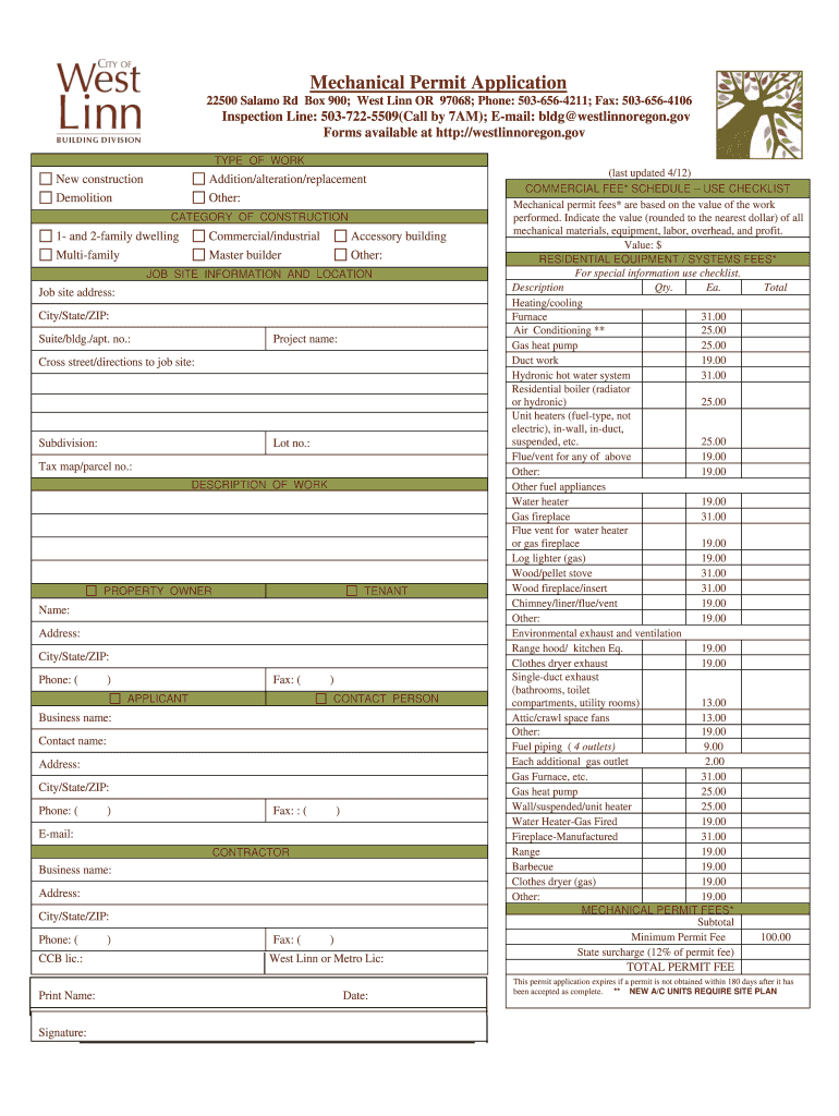 Mechanical Permit Application 22500 Alamo Rd Box 900; West Linn OR 97068; Phone: 503-656-4211; Fax: 503-656-4106 Inspection Line: 503-722-5509(Call by 7AM); E ...
