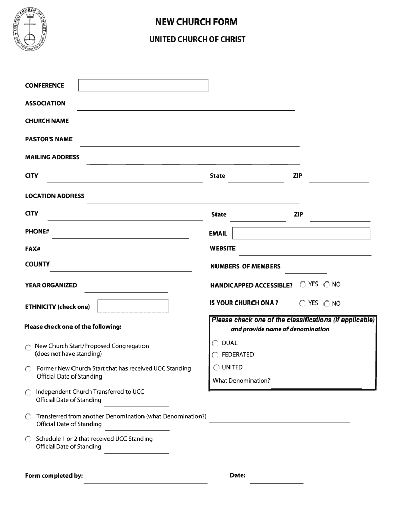 The new church form can be filled out online or by mail, providing necessary information about the organization.